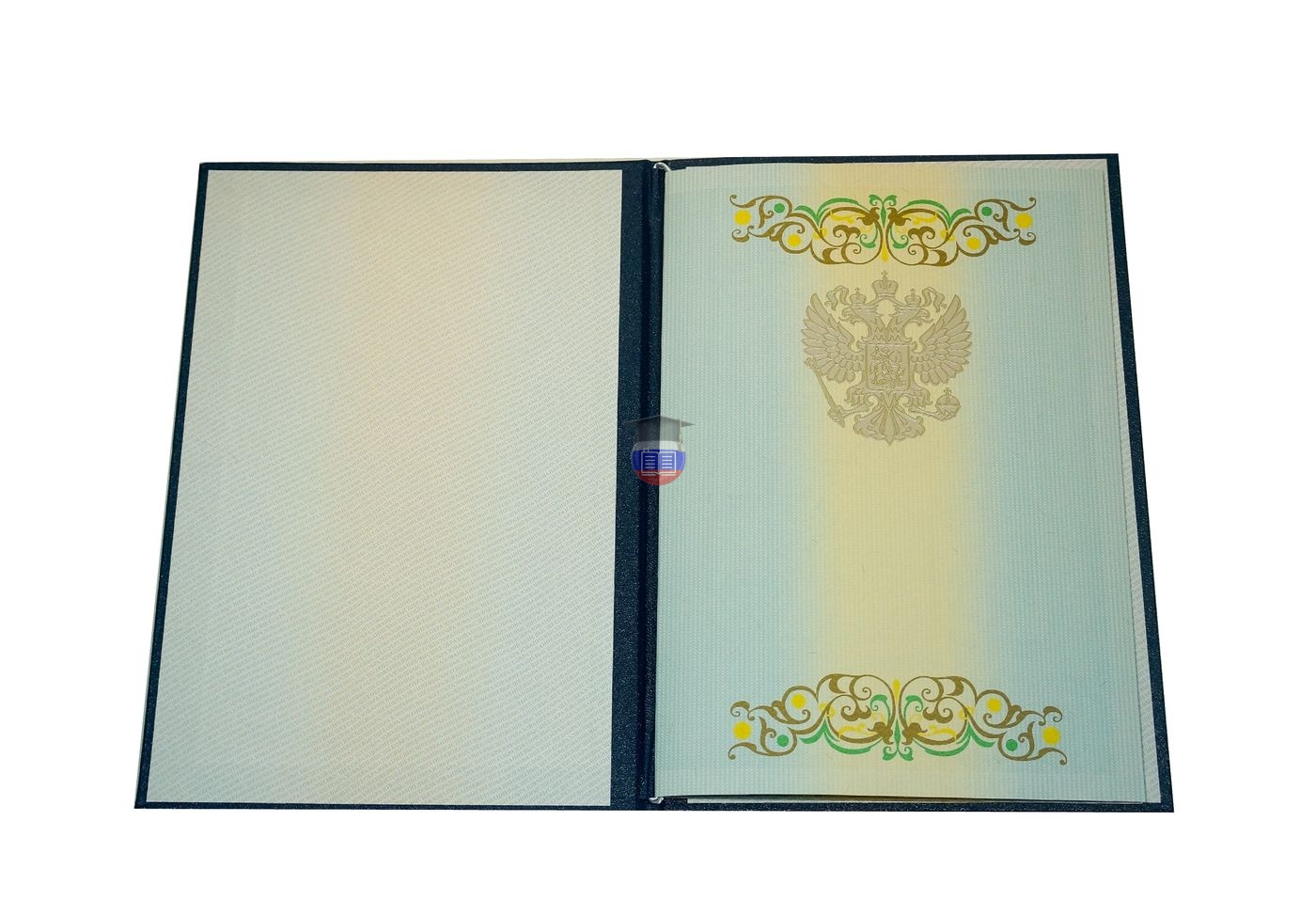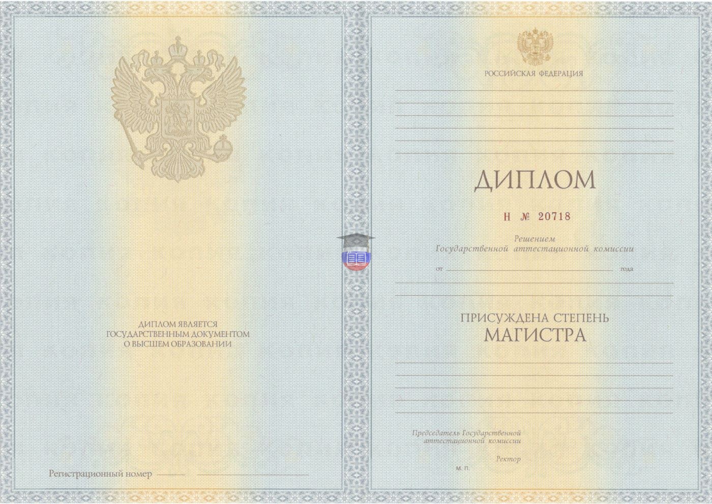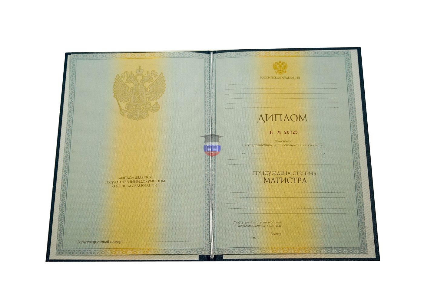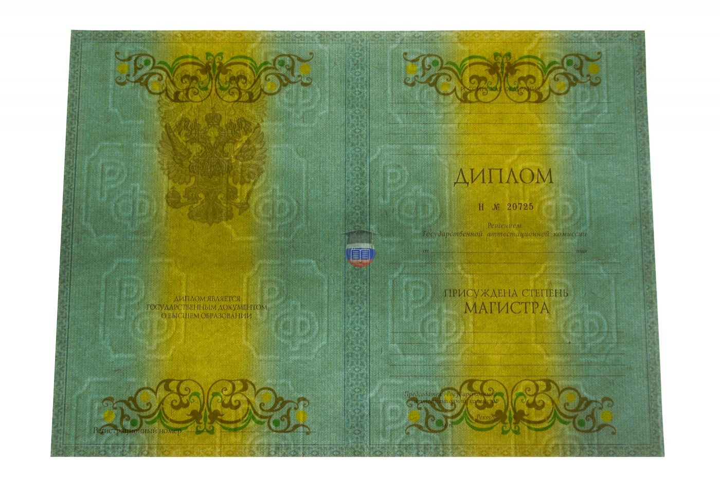 Диплом магистра напечатан на бланке государственного образца «Гознак». Документ включает приложение и корочку. Защита бланка — специальные водяные знаки, микротекст, узор из непрерывных линий, герб России, цветовой переход. Бумага с подлинной печатью учебного учреждения заполняется согласно его уставу.