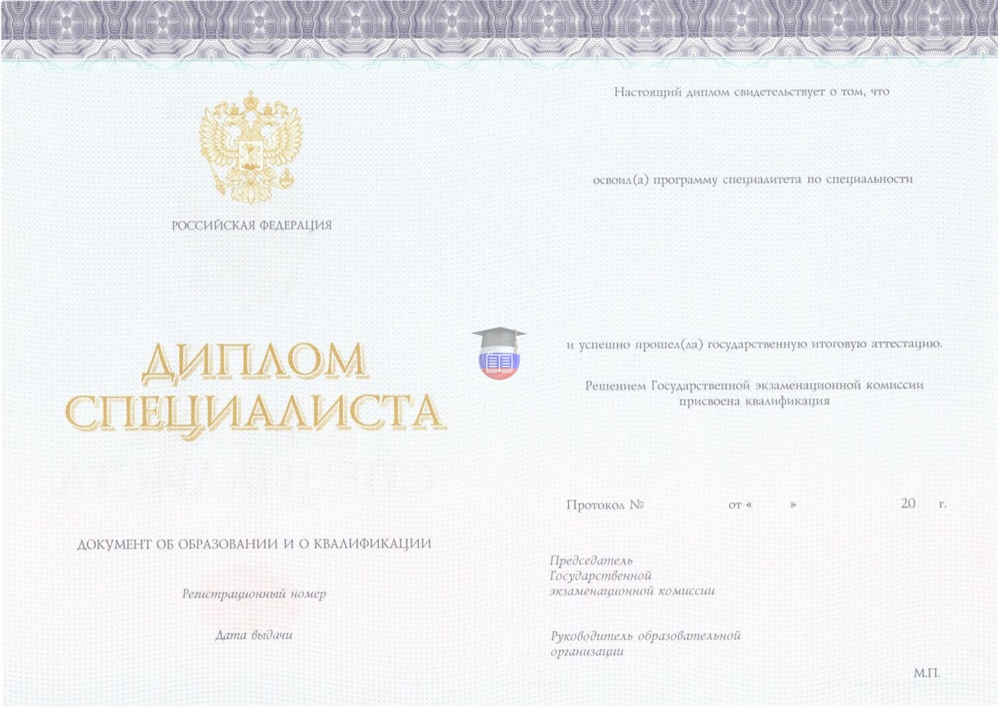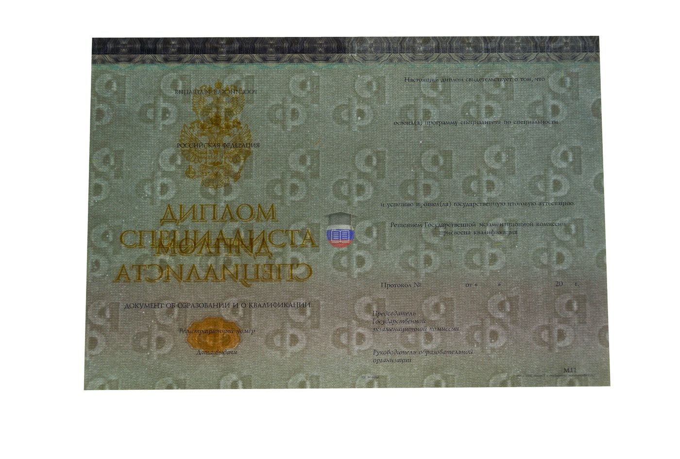 Диплом специалиста — документ о присвоении квалификации после прохождения специальной программы обучения. Её особенности — узкий профиль, сочетание углубленной теории с практикой, обучение в течение 5-5,5 лет. В комплекте — бланк установленного образца, заполненный по правилам Минобразования и науки РФ. Степени защиты — голографические знаки, водяной оттиск, узор из непрерывных линий, мокрая печать вуза, регистрационный номер соответствующий региону выдачи.