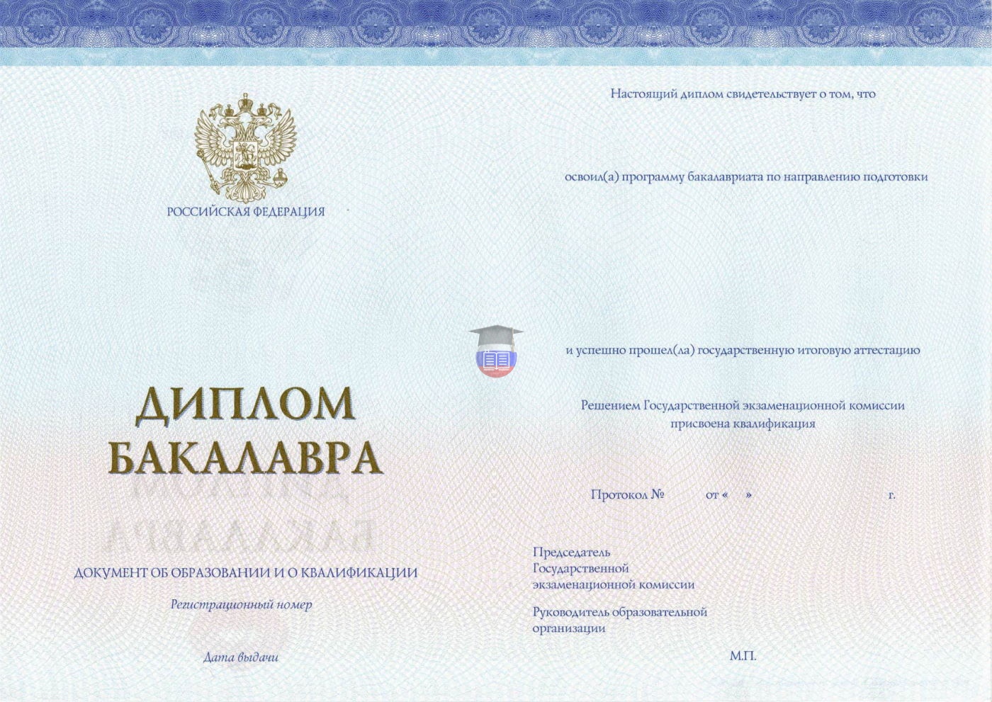 Диплом бакалавра — базовый документ о высшем образовании. Именно он подтверждает успешное прохождение четырехлетнего курса обучения с присвоением академической степени. Бланк заполняется по стандартам образования и науки России. Степени защиты — герб России, сетка из непрерывных линий, офсетная печать, водяные знаки, уникальный регистрационный номер, невозможность копирования на принтере. Оценочный лист и синяя корочка в комплекте.